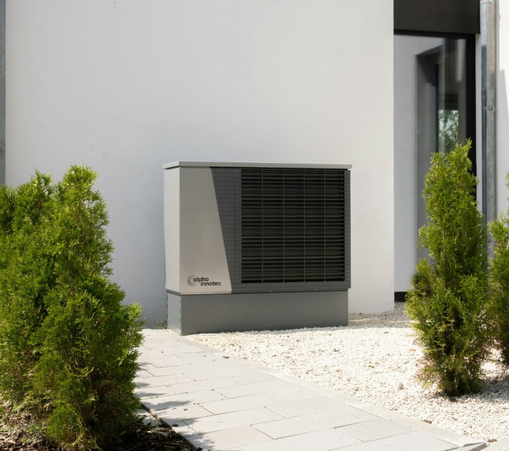 Installation einer modernen Wärmepumpe für ein energieeffizientes Einfamilienhaus.